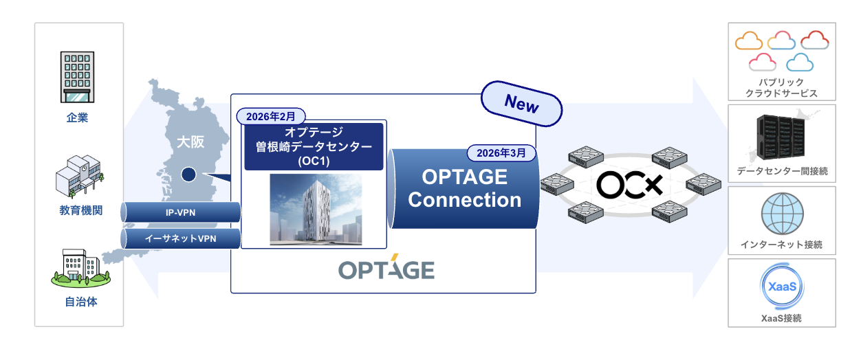 BBIX株式会社(本社:東京都港区、代表取締役社長 兼 CEO:佐々木秀幸、以下「BBIX」)と株式会社オプテージ(本社:大阪府大阪市、代表取締役 社長 :名部正彦、以下「オプテージ」)は、2023年11月に締結したBBIXおよびBBSakura Networks株式会社(本社:東京都新宿区、代表取締役社長 兼 CEO:川畑裕行、以下「BBSakura」)が共同で提供するクラウド型ネットワークサービス「Open Connectivity eXchange(以下「OCX」)」に関する協業契約に続き、次世代のネットワークインフラ構築を見据えて協業範囲を拡大することをお知らせします。協業範囲拡大の一環として、BBIXは2026年2月に「オプテージ曽根崎データセンター(OC1)」に、OCXの接続拠点を開設するとともに、2026年3月には、OCXとオプテージの閉域網の相互接続サービス「OPTAGE Connection」を提供開始します。